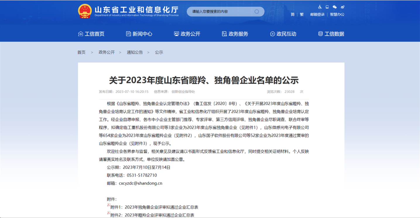 據悉,根據《山東省瞪羚、獨角獸企業認定管理辦法》《關于開展2023年度山東省瞪羚、獨角獸企業培育認定工作的通知》等文件精神,省工業和信息化廳組織開展了2023年度山東省瞪羚、獨角獸企業培育認定工作。經企業自愿申報、各市中小企業主管部門推薦、專家評審、第三方信用評級、聯合終審等程序,確定了2023年度山東省瞪羚、獨角獸企業名單。