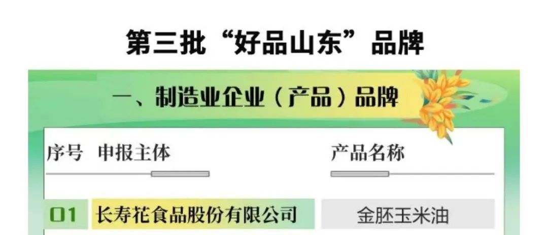 5月10日,山東省人民政府新聞辦公室在青州市博物館舉行中國品牌日系列活動現場新聞發布會,邀請山東省市場監督管理局負責同志等介紹山東省品牌戰略推進工作情況,并發布第三批“好品山東”品牌名單。長壽花金胚玉米油榮登“好品山東”品牌榜,并位列榜單首位,用卓越品質成就玉米油品牌典范。