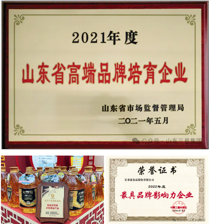 企業先后獲評中國糧油領軍品牌、最具品牌影響力企業、山東省高端品牌培育企業等榮譽稱號,并多次上榜中國品牌力指數top10榜單,連續多年獲評中國玉米油加工企業10強首位。產品品牌還攬獲中國好糧油示范產品、中國綠色食品博覽會金獎、山東優質品牌產品等諸多獎項,并是“我最喜愛的齊魯糧油產品”中唯一的玉米油品牌。