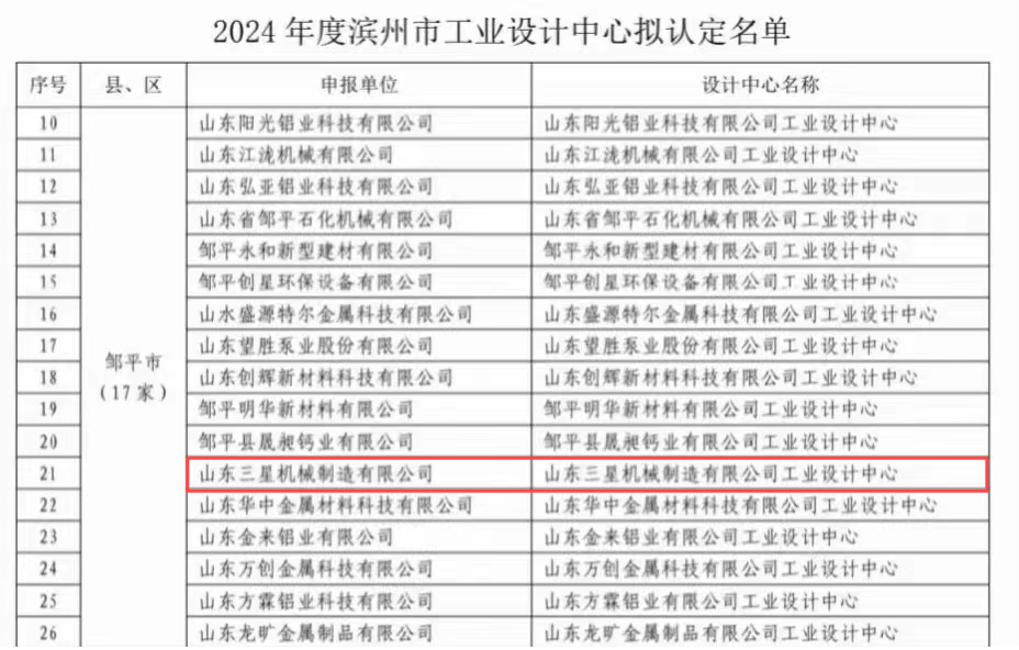 近日,濱州市工信局對《2024年度濱州市工業設計中心擬認定名單》進行公示,山東三星集團機械公司通過濱州市工業設計中心認定。