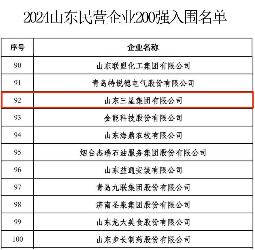 近日,山東省工商聯公示了2024山東民營企業百強系列榜單入圍名單。山東三星集團憑借雄厚的產業實力、強勁的發展潛力和廣闊的市場前景,入圍2024山東民營企業200強名單。