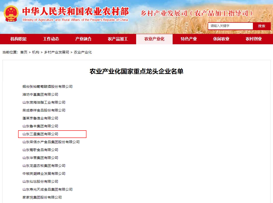 近日,農業農村部公布了新一批“農業產業化國家重點龍頭企業”名單,山東三星集團順利通過監測評估,自2011年通過認定以來,已連續15年被認定為農業產業化國家重點龍頭企業。